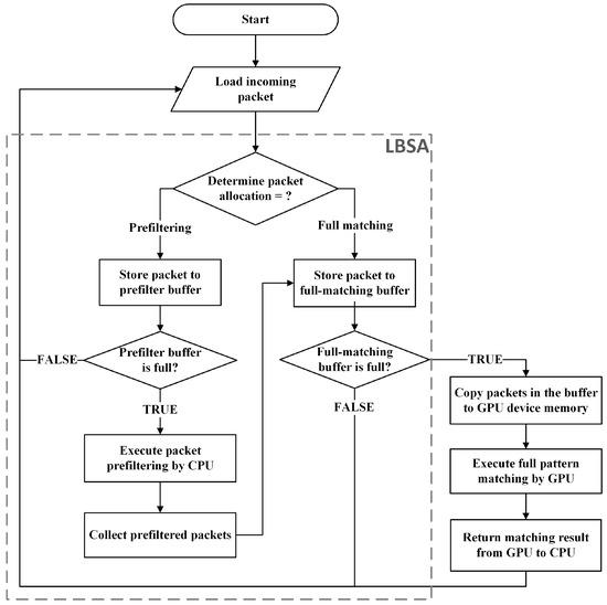 Initially, the prefilter buffer TPB and the full matching buffer TFB are empty. In addition, a payload set Pfiltered is declared to temporarily store the prefiltering results, which is also empty (Lines 1–3). A variable idxPB, the index of prefilter buffer entries, is set to zero (Line 4). For each payload in P, the LBSA measures the payload length of packet Pi (denoted as Li) for comparing it with the length bound Lb (Lines 5 and 6). If the payload length Li exceeds the bound (longer than Lb), the system stores this packet in the prefilter buffer TPB and waits for the CPU prefiltering process (Lines 7 and 8). After the packet is stored in TPB, the index of prefilter buffer entries idxPB increases for the next insert (Line 9). Otherwise, this packet will be stored in the full matching buffer TFB to wait for the GPU full pattern matching (Lines 10 and 11).