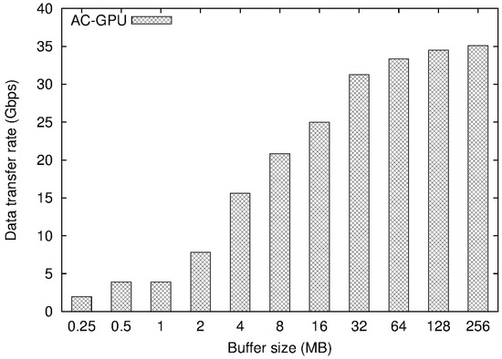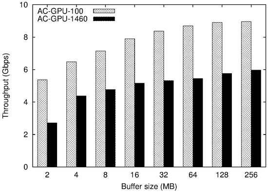 Figure 5 illustrates the GPU performance with different sizes of the full matching buffer. The x-axis represents the buffer sizes, and the y-axis indicates the average throughputs performed in Gbps. Here, both short (100-byte) and long (1460-byte) packet payload sets were prepared, which were represented with “AC-GPU-100” and “AC-GPU-1460”, respectively. As Figure 4 presented, the performance became low with small buffer size, especially in the case of AC-GPU-1460 with 2 MB buffer size. In addition to the data transfer rate, the number of packet payloads were few in this case, resulting in low GPU thread utilization and thus degrading overall performance. In other words, the input payload set length also affects the GPU efficiency. Shorter packets can be collected into a larger number of packets, which is favorable for the parallel processing power of GPU—hence, the efficiency of AC-GPU-100 displayed from 5.37 Gbps to 9.03 Gbps, which was higher than that of AC-GPU-1460, from 2.71 Gbps to 6.10 Gbps.