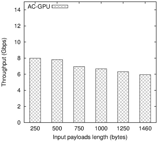 Figure 6 presents the GPU performance with different lengths of payload sets. Here, a total of six payload sets were prepared, which are 250-byte to 1460-byte (the maximum length of payload) long, as represented in the x-axis. The y-axis indicates the average throughputs performed in Gbps. The result shows that shorter payloads are favorable to the GPU efficiency, in which the GPU performed up to 8.0 Gbps with a 250-byte set. As the payload length increased, an obvious performance degradation occurred in the case of 750-byte set, and the throughput gradually decreased to 5.9 Gbps with a 1460-byte set. Since the number of short payloads in the GPU device memory is more than that of longer payloads, more benefits from multithread parallel processing can be made due to the number of GPU cores being much larger than the number of CPU cores.
