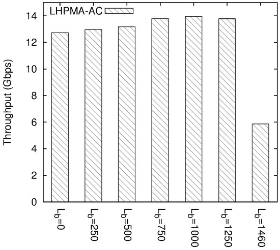 With respect to the LHPMA results, we initially observe the effect of payload length bound on LHPMA. The LHPMA performance, with the packet trace described in the previous subsection as input, and different settings of bound Lb are displayed in Figure 7. The x-axis represents the selected Lb values, and the y-axis indicates the average throughputs in Gbps. According to this figure, the case of Lb = 0 indicates that all of the incoming packets passed the prefilter with performance 12.7 Gbps. As the Lb value increased, the performance upgraded to 14.0 Gbps. In particular, a specific case appeared with Lb = 750, which corresponded to the result in Figure 6. In other words, since the payload length diversity is reduced, some performance gains were thus obtained. On the other hand, the case of Lb = 1460 revealed a performance degradation of 5.9 Gbps. This is because all of the incoming packets were sent to the GPU without passing the prefiltering. The degradation was caused by both data transfer latency and payload length diversity.