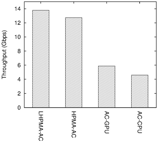 Figure 4, Figure 5, Figure 6, Figure 7 and Figure 8 show the preliminary experiment results, in which the notations “LHPMA-AC” and “HPMA-AC”, respectively, indicate the LHPMA and HPMA matching methods, and both methods ported the AC algorithm to handle the full pattern matching task. On the other hand, the notations “AC-GPU” and “AC-CPU” are the matching methods that directly inspect the packets by the AC algorithm using the GPU and CPU, respectively.