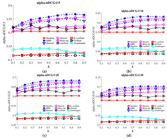 a-Normalized discounted cumulative gain (a-nDCG) at various levels @5, @10, @20, @30 for baseline, MMR, Max-sum, Max-min, Mono-objective, LexRank, Biased LexRank, DivRank and Grasshopper methods. (a) alpha-nDCG@5; (b) alpha-nDCG@10; (c) alpha-nDCG@20; (d) alpha-nDCG@30. (Best viewed in color.)