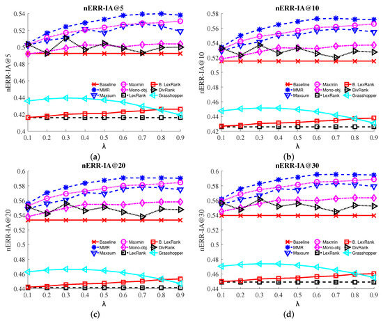 Normalized expected reciprocal rank-intent aware (nERR-IA) at various levels @5, @10, @20, @30 for baseline and the MMR, Max-sum, Max-min, Mono-objective, LexRank, Biased LexRank, DivRank and Grasshopper methods. (a) nERR-IA@5; (b) nERR-IA@10; (c) nERR-IA@20; (d) nERR-IA@30. (Best viewed in color.)