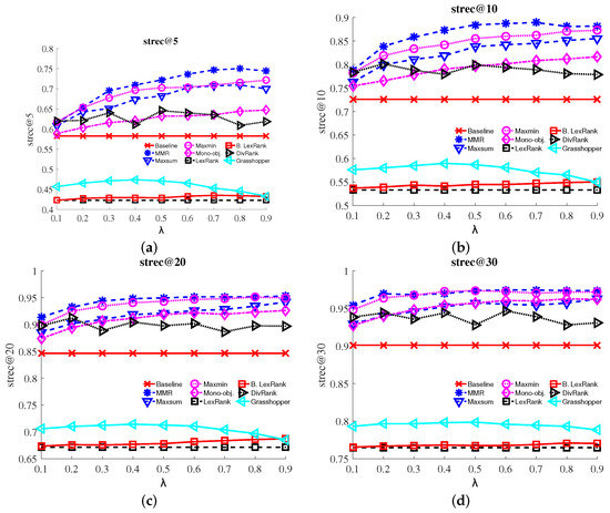 Subtopic recall (S-recall) at various levels @5, @10, @20, @30 for the baseline and the MMR, Max-sum, Max-min, Mono-objective, LexRank, Biased LexRank, DivRank and Grasshopper methods. (a) S-recall@5; (b) S-recall@10; (c) S-recall@20; (d) S-recall@30. (Best viewed in color.)