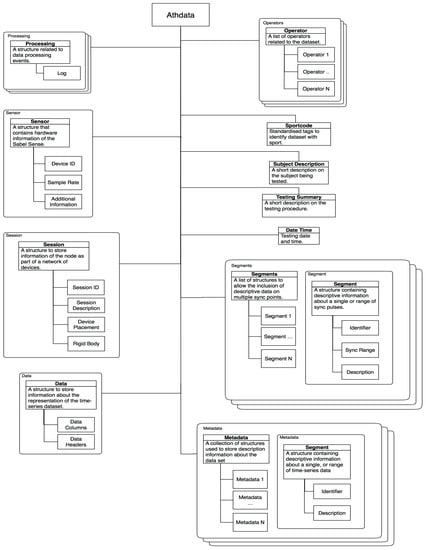 The Athdata structure was used as a central communication tool between the logical layers of data collection, storage, processing and feedback to users for intended purposes, e.g., motor learning applications, be they near real-time or for post processing intervention. This was initially determined by detailed user requirement analysis for the sport of swimming []. The functional blocks consisted of data sources, data transport, staging/transformation, storage, analysis and retrieval. Existing development on the Athdata structure saw the use of the MATLAB data science environment as the primary platform of implementation. However, this provided limitations in the development of a distributed collection and management of inhomogeneous data sources, particular with MATLAB specific data structures. Primary focus for the redevelopment and the extension of the structure required the ability for primary data types, generic in implementation to accommodate various implementation methods for collections of disjointed data, which was undertaken in Unified Modelling Language (UML). The UML representation of the improved structure used for the implementation (Figure 1). This was extended to a cloud based system. The major challenge for the development of the structure was to provide the ability to have sessional context of a data source in relation to varying inhomogeneous data sources. From an implementation perspective, a major challenge was generated from the requirements for the existing MATLAB structure to be implemented in standard data types, for example, by allowing implementation in an SQL database backend. Thus, the updated implementation was intended to be provided as a specification of implementation, rather than an implementation method perse. The use of MATLAB was considered advantageous on balance, despite being a proprietary technology, as it was a common tool across the deployment sites.