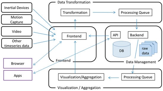 Because of the time-dependent nature of feedback, the efficient handling and flow of time series data was critical. In all applications, data transport required the processing of moving data from specific data sources, both from operators manually uploading or automatic transport from wearable devices through modern internet based protocols e.g., IPv6. Transformation includes the process of taking various distributed inhomogeneous data sources and compiling them into a converging uniform data structure—therefore, allowing the ability for autonomous and operator based metadata indexing for future processing. Storage provides an interface for the long-term storage and retrieval of indexed data sources including the file storage of archived original data sources and exported transformed data structures. Analysis includes the ability for the system to provide interfaces for the processing of transformed and indexed data sources. This allows for the retrieval of cached indexed homogeneous data structured through exported data sources as well as system visualisation and aggregation through integrated layers (Figure 2).