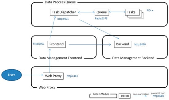 The developed system was modelled closely following a service-orientated framework—by which, each module is developed as a micro-service application that plays a specific and detected role within the cloud system stack—abstracted to four primary modules, formally named, Data Process Queue, Data Management Frontend, Data Management Backend and the Web Proxy (Figure 3).