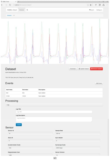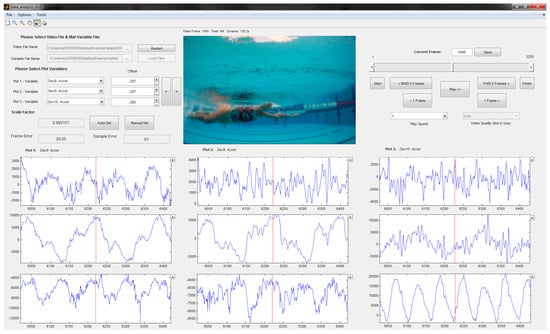 This large amount of data would be difficult to distribute and search if it were stored as flat files. Using the developed framework, the data capture can be indexed and becomes accessible to any researcher it is shared with. The indexed metadata is also searchable, providing easy access to sessions and data relevant to a current area of interest. Analysis of data is typically performed using standalone tools either commercially available or written in-house. An example of one of these tools is the SABEL data analysis tool [], which was applied to one of the swimmers in the data capture set (Figure 6). This tool enables the time series inertial sensor data to be synchronised to video data, thereby giving the data context. The data can then be analysed to find key patterns or events to be used in specific algorithm development.