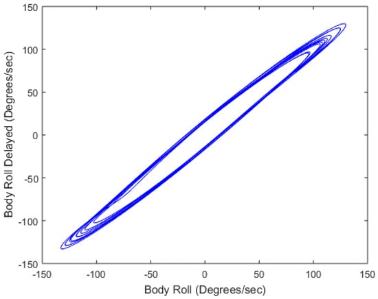 To illustrate the concept, one of the swimmer’s from the data capture was used to visualise the body roll when swimming a single lap of freestyle. The body roll is defined as the clockwise and anti-clockwise roll of the body whilst the arms are performing the strokes. The aim for the athlete is to be as consistent as possible in the strokes to minimise extraneous effort such as profile drag. This, in turn, means that the body roll will also be consistent. The sensor unit was located on the sacrum of the swimmer and the gyroscope channel examined aligned to the direction of the spine. The data was initially examined using the tool displayed in Figure 6. The state-space diagram with a delay of three was generated using the method detailed in Rowlands et al. [] (Figure 7). The maximum and minimum roll velocities of the body during the left and right arm stroke actions are given at the extents of the diagram. It can be seen that, by examining the contours at the extents of the diagram, the action is asymmetric with variability that changes over time. The coach can then use this information to provide feedback to the swimmer.