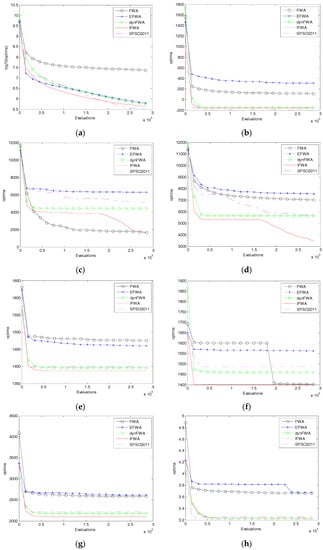 The FWA, EFWA, dynFWA, SPSO2011 and IFWA searching curves. (a) f2 function; (b) f12 function; (c) f22 function; (d) f23 function; (e) f25 function; (f) f26 function; (g) f27 function; (h) f28 function.