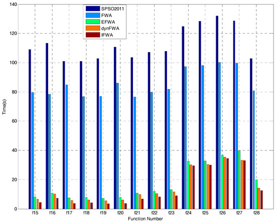 Figure 3 and Figure 4 show comparison of average run-time cost in 28 functions for FWA, EFWA, dynFWA, SPSO2011 and IFWA.