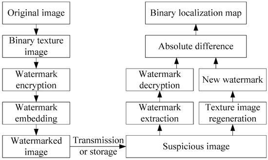 In image transmission or storage, the content of the digital image might be destroyed by malicious attacks, which makes its texture information inconsistent with the original image. We take advantage of this property to realize tamper detection and localization. The watermarked image is firstly permuted by Arnold transform with secret key . Then, the encrypted watermark is extracted from the LSB plane of suspicious image. With the help of secret key , we obtain the decrypted watermark. In addition, a new texture image is regenerated via the same first four steps in the watermark embedding process. By taking the absolute difference between the regenerated texture image and extracted information, a binary localization map is obtained. From this detection map, the tampered region can be determined.