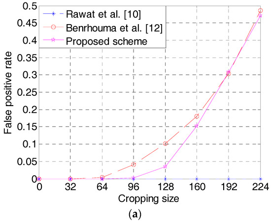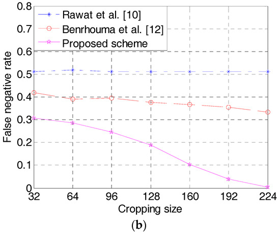 To further test the precision of tamper localization, two evaluation indexes including the false positive rate (FPR) and false negative rate (FNR) are employed in this paper [21]. The FPR refers to the ratio of authentic pixels that are falsely detected as distorted pixels, and the FNR is the ratio of tampered pixels that are incorrectly detected as authentic pixels. Generally, the lower FPR and FNR mean better localization accuracy. Figure 11 illustrates the FPR and FNR comparisons of the above three methods under different cropping sizes. From Figure 11a, we can observe that the FPR values in Rawat et al.’s method [10] are almost zeros. However, the FNR values in Figure 11b are all greater than 0.5. In addition, a binary reference image in [10] is needed on the receiving end for image authentication, which is impractical in real life. Compared with Benrhouma et al.’s algorithm [12], the proposed scheme achieves lower FPR except in cropping size 192 × 192. Notably, the FNR of the proposed scheme is much lower than that of the methods in [10,12]. From Figure 11, it suggests that the proposed authentication algorithm has lower detection errors and higher detection and localization accuracy.