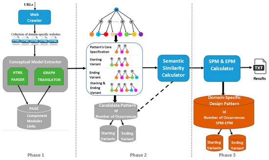 In the first phase, we utilize a web crawler which crawls all of the pages of a set of websites in a target application domain and locally stores them on the user’s computer, thus creating a collection of domain-specific websites. Then, we utilize the “Conceptual Model Extractor” tool to capture their designs by extracting their conceptual models. At the hypertext level, the conceptual model of a website specifies its composition and navigation, i.e., the organization of its front-end interfaces in terms of pages, made of design elements which are linked to support the user’s navigation and interaction. Thus, the main task for automatically extracting the conceptual model of a website is to identify the organization of the front-end design elements that compose the hypertext of its HTML pages.