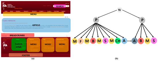 (a) The organization of a page in terms of Joomla! design elements (component and modules); and (b) The equivalent graph representation of the page’s hypertext.