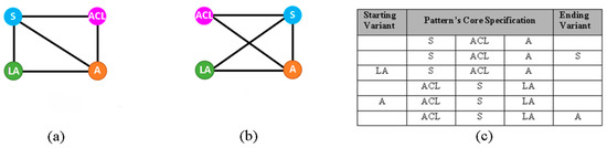 To locate the recurrent patterns (their core specifications along with their starting and termination variants) occurring among the set of conceptual models, we have reduced the problem of their identification into the domain of graph mining, and particularly to the subgraph isomorphism problem. The latter is synopsized in its general form into finding whether the isomorphic image of a subgraph exists in a larger graph. An example of an isomorphic image of a subgraph is depicted in Figure 3. The subgraph in Figure 3b is isomorphic to the subgraph in Figure 3a. As we can see, despite the different configuration of nodes in the two subgraphs, the edges connecting the nodes of the same color remain the same. The table in Figure 3c contains some sequences of the nodes that are connected in the subgraphs of Figure 3a,b. For example, a sequence can start from node S, from which one can navigate to node article category list (ACL) and then navigate to node A, and so on. By observing the node sequences, one can notice that they can actually reveal the recurrent patterns occurring within a graph, both their core specifications and their starting and termination variants. Clearly, the identification of the isomorphic subgraphs within a graph is an alternative way to obtain the identification of the incorporated recurrent patterns.