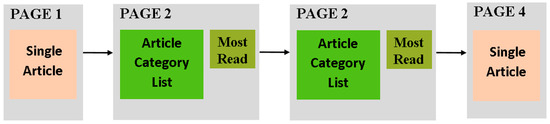 Another example of a template involving more than one page is depicted in Figure 6 which presents a commonly used pattern for supporting the user’s navigation among the hierarchy of categories and subcategories of information objects. It consists of four pages: the first page presents content about an information item, from which users can navigate to a second page displaying a list of its categories. Then, by selecting a list item users can have access to a third page of the same type displaying a list with the subcategories of the selected category and, finally, by selecting a list item, users can navigate to a fourth article page displaying information about the selected subcategory. Both of the pages in Figure 6 that present a list with the categories and subcategories include a most read articles module in order to allow users navigate to the most frequently visited pages, shortening the navigation path to them and acting as a mechanism for navigating backward and forward through the website pages, regardless of the hierarchical level to which these pages belong.