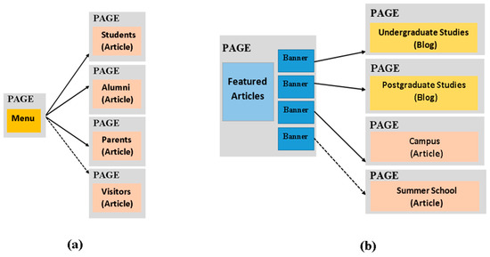 Navigation Category: this category includes patterns which correspond to reusable navigation structures used in the various website designs for providing access to various sets of domain concepts, i.e., information objects. For example, Figure 7a presents the most common way for browsing the various types of end-users (i.e., students, alumni, and parents) which is realized with the use of a menu having links to the pages of the corresponding user category. Except for the commonly used types of end-users, we have also identified a pattern variant, including a link to a page publishing information about the visitor user type, occurring in a very small number of websites in the collection. Similarly, Figure 7b presents a commonly used pattern on the home page of educational websites for supporting the navigation to the pages publishing information about the undergraduate and postgraduate studies and campus life. This is realized by using four banners on the home page which navigate users to the corresponding pages. We have also identified a pattern variant including a link to a page publishing content about the summer school which is available on some of the collected websites.