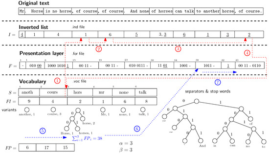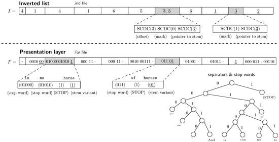 PISI naturally undergoes all the following procedures during the construction phase. The indexed text is case folded (all letters are reduced to lower case), stopped (so-called stop words are omitted) and stemmed (all words are reduced to their stems using Porter stemming algorithm [21]). PISI uses its presentation layer (proposed by Fariña et al. [17]) to store the information lost during the aforementioned procedures. The presentation layer (see the array F) contains one (possibly empty) entry for every word of the inverted list. The entry is composed of the Huffman codes of all non-alphanumeric words and all stop words preceding the corresponding word. The entry is terminated by the Huffman code of a variant of the word (the underscored bits in the array F). The presentation layer needs to be synchronized with the inverted list (array I). PISI stores a pointer to the presentation layer for every β-th word position in the inverted list. The pointers are stored as the offset from the previous pointer in the array . For , PISI stores the pointer for: 3rd, 6th and 9th position in the inverted list. These positions are: 6, 23 and 38. Thus, the stored offsets are: 6, 17 and 15. Furthermore, the vocabulary stores the textual representation of the stems, their word variants and the corresponding Huffman trees used for encoding of these variants. For the stems with just one variant, no Huffman tree needs to be stored and the variant is not encoded in the presentation layer either. The vocabulary also stores the common Huffman tree that is used to encode the non-alphanumeric words and the stop words. The next component of the vocabulary is the array storing the first word positions (in the array I) of the corresponding words in the vocabulary.