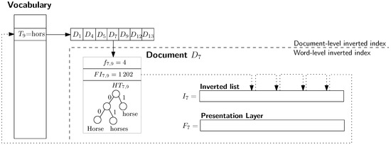 We can observe in Figure 3 that the stem “hors” occurs i.a. in the document . The document contains occurrences of the stem in the tree different variants (see the Huffman tree ). The first occurrence is at the position . The last position of the stem stores a back pointer to the vocabulary entry . The dashed line determines a border between the two components: standard (document-level) inverted index and the word-level inverted index (PISI).