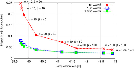 Compression ratio/Snippet time trade-off. The time is stated in microseconds per character.
