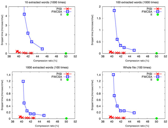 Figure 5 shows a trade-off between the compression ratio and the time needed to extract a snippet. The snippet time includes search time and a time needed to extract a certain number of words (10, 100, 1000 and the whole file). We tested so-called bag-of-words search with four words randomly chosen of the indexed text. We compare three different indexes: our PISI, word-based self-index FWCSA proposed by Fariña et al. in [17] and the standard positional inverted index II. II is our implementation and it uses SCDC encoded inverted lists. The text accompanying the index is SCDC encoded, as well. All the parameters of FWCSA were set to power of two ensuring the highest possible speed. Disregarding the number of extracted words, all the presented charts show very similar curves. The standard positional inverted index (II) provides the best snippet time ( second per extracted character for 1000 extracted words). However, the inverted index together with the compressed file (which cannot be replaced) achieve the worst compression ratio %. The fastest instance of PISI with achieved compression ratio % proved to be 2–3 times slower than II (with snippet time s per extracted character for 1000 extracted words). Furthermore, PISI proved to achieve usually an order of magnitude better snippet time at some level of compression ratio in comparison to FWCSA, e.g., PISI with compression ratio % achieves snippet time s per extracted character for 10 extracted words. On the other hand, FWCSA with compression ratio % achieves snippet time s per extracted character for 10 extracted words. Finally, PISI is able to achieve the best compression ratio among of all tested algorithms, which is %.