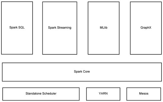 Apache Spark Framework [11,44] is a newer framework built in the same principles as Hadoop. While Hadoop is ideal for large batch processes, it drops in performance in certain scenarios, as in iterative or graph based algorithms. Another problem of Hadoop is that it does not cache intermediate data for faster performance, but, instead, it flushes the data to the disk between each step. In contrast, Spark maintains the data in the workers’ memory, and, as a result, it outperforms Hadoop in algorithms that require many operations. It is a unified stack of multiple closely integrated components and overcomes the issues of Hadoop. In addition, it has a Directed Acyclic Graph (DAG) execution engine that supports cyclic data flow and in-memory computing. As a result, it can run programs up to faster than Hadoop in memory, or faster on disk. Spark offers APIs (Application Programming Interface) in Scala, Java, Python and R and can operate on Hadoop or standalone while using HDFS (Hadoop Distributed File System), Cassandra or HBase. The architecture of Apache Spark Framework is depicted in Figure 2.