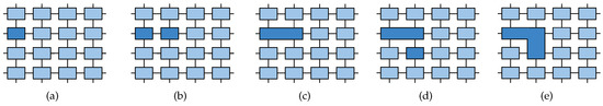 Merging process of tiles: For a given tile (a), at a given step, one of its neighbors is considered as a candidate for merging (b). Their similarity is above the given threshold S, thus they are merged (c). At another step, one neighbor of the new tile is considered as a candidate for merging (d). Their similarity is above S, thus, they are merged (e).