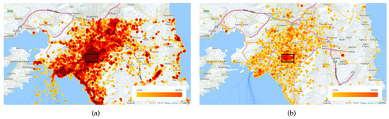 Density-based visualizations regarding the distribution of geo-tagged photos (a) and POIs (b) in the broader region of Attica and the centre of Athens.