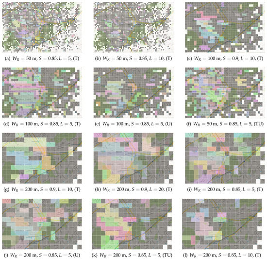 Geo-clusters produced within the selected urban area, i.e., the center of the city of Athens for several parameters of the proposed algorithm. Each geo-cluster has been randomly colored. Initial tile boundaries are overlaid. Tiles colored with white did not initially contain any photo, thus were excluded from the algorithm.