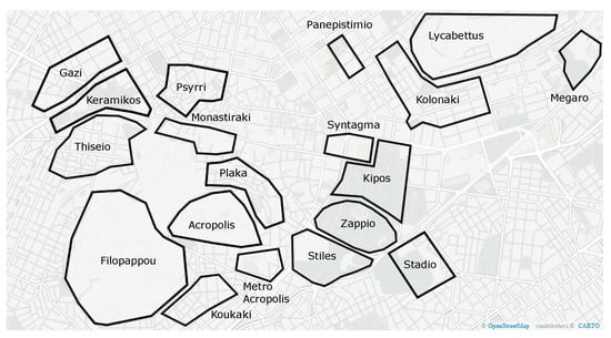 More specifically, the herein presented approach is based on a large Flickr dataset consisting of approx. 80 K geo-tagged images taken in the center of Athens, Greece. Since the boundaries of the vernacular regions are not strictly defined, we evaluate the produced results using a ground truth generated by local residents that reflects their perception of vernacular regions; in many AOI detection approaches, e.g., in [10], this approach is considered to be the most appropriate in order to define the corresponding boundaries.As we have already mentioned, the perception of AOIs between a tourist and a resident is significantly different. Thus, in the ground truth generation process, though participants were current or former residents, they were asked to identify the corresponding type of AOIs seen from a tourist’s perspective. We should clarify herein that for the sake of evaluation we use a set of touristic POIs from the socially generated database of OpenStreetMap. (https://www.openstreetmap.org/).