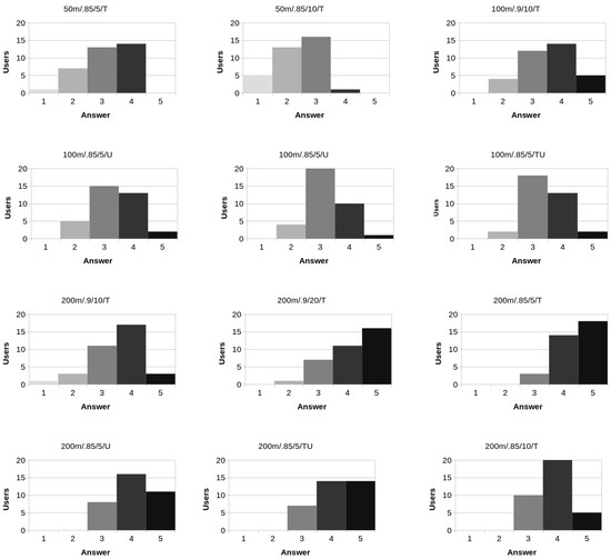 As we may observe, Q1 is a Likert-type question [45]. Since we feel that users may not be divided into groups of age, since all of them are between 19–24 years old and a male-female split is not valid for the problem at hand, we opt not to perform any non-parametric test. Instead, we present some basic statistics to show central tendency (median and mode) and variability (inter-quartile ranges) [46] for each of the clustering that have been presented in Figure 4. Results are depicted in Table 3. Moreover, we illustrate bar charts for each clustering result in Figure 6, while results for Q2 are summarized in Table 4.