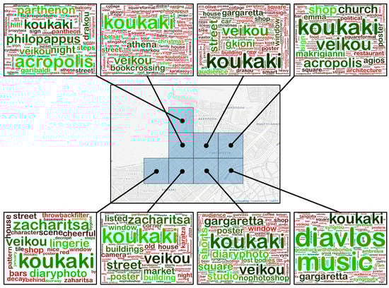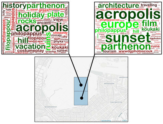 Furthermore, in Figure 7 and Figure 8 we present two cases of the tags contained into each tile of two geo-clusters. The first corresponds to an area known as “Filopappou hill”, (https://en.wikipedia.org/wiki/Philopappos_Monument) which offers views of a large part of Athens and Attica in general, some ancient monuments (ruins) and provides excellent view to the Acropolis, preferred by tourists for taking photos. The latter, known as “Koukaki” (https://en.wikipedia.org/wiki/Koukaki) is a rather popular neighborhood mainly due to its proximity to the Acropolis, its excellent connection to all means of transportation along with its bars and restaurants. Moreover, in Figure 9 we illustrate the tag clouds that describe in total each of the aforementioned geo-clusters. It is clear that the most important tags (i.e., those depicted in red and in larger fonts) are rather useful for describing each area. Finally, in Figure 10 we illustrate the top-3 tags resulting upon the application of TF-IDF to the clustering depicted in Figure 4i. A reader which is familiar to the city of Athens, may easily perceive the usefulness of these tags both to describe the semantics of an area and to discover its name. The aforementioned qualitative evaluation was similarly performed.