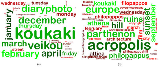 Tag clouds extracted from merged tiles that correspond to the extracted area that has been characterized as Filopappou. Top-10 (most important) tags have been colored in shades of green, while less important ones in shades of red. The font size is proportional to tag frequency.