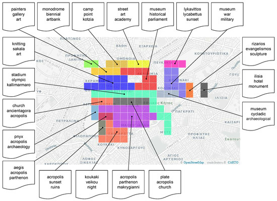 In total, we performed 36 experiments, however we opted to present a subset of them, so as to facilitate both the reader and the qualitative evaluation process, presented in Section 4.2.2 and ruled out those that produced either a large number of relatively small AOIs (e.g., consisting of 1–2 tiles) or a small number of relatively large AOIs (e.g., less than 5 AOIs in total). The selected cases along with the results of the proposed algorithm are summarized in Figure 4. Results using the aforementioned metrics are summarized in Table 2. By careful observation of this table, we may come to the following conclusions: Lower tile sizes (i.e., m) in general lead to more smaller clusters with smaller number of contained POIs, visitors and consequently photos. On the contrary, by increasing tile size (i.e., setting m), allows clusters to become more cohesive. As it will be presented in next Section 4.2.2, this is a feature appreciated by real-life users.