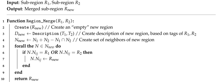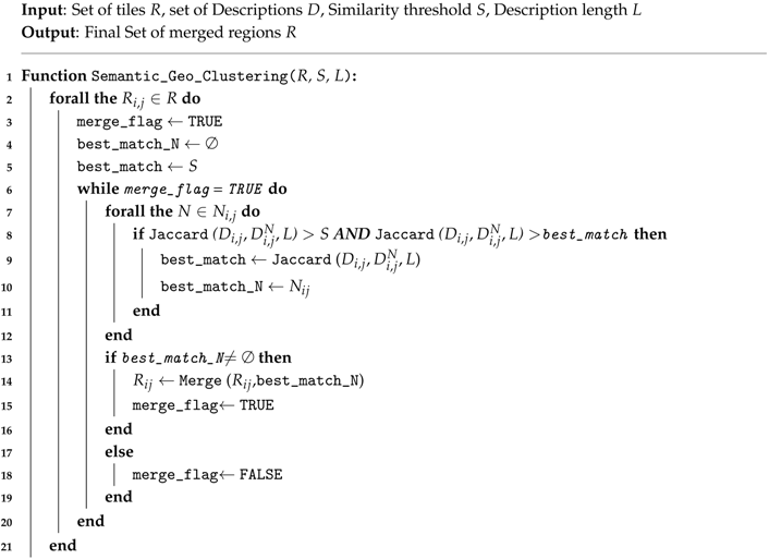 The merging process begins from the tile , i.e., the one of the first row, first column and continues horizontally. The distance to all its neighbors is checked. It is merged with the tile whose similarity is the max among all those whose similarity is greater than S, if any. For a new tile, its description is calculated based on the union of the sets of tags and the process continues by checking the similarities to its neighbors. In case there does not exist a neighbor with similarity greater than S, the process continues with the next tile which has not been merged. A graphical example of the tile merging process is illustrated in Figure 2. The semantic geo-clustering process is presented in pseudocode in Algorithm 1, while we also present pseudocode for Jaccard similarity and the region merging process for the sake of clarity in Algorithms 2 and 3, respectively.