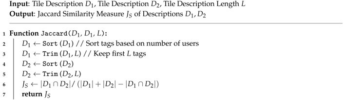 where in our case are the sets of tags that have been chosen to represent two tiles, e.g., using the methodology described in Section 3.2. Using the aforementioned notation, tiles with descriptions are merged when (a) they are neighbors and (b) , where is a user-defined similarity threshold.