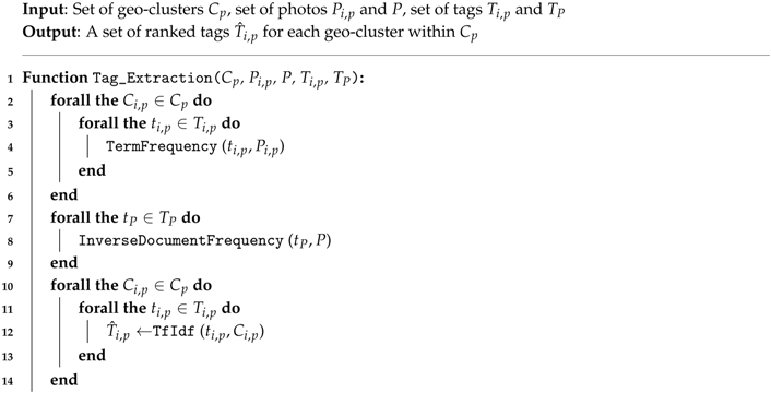 Considering both the limited spatial boundaries of the examined area in the context of our experiments, along with the fact that it is rather usual for a city to contain a relative small number of AOIs, we calculate the inverse document frequency for a given tag x by dividing the total number of photos contained in the dataset by the number of those that include x, instead of relying solely on the fraction of regions where it appears. As a result, it is possible to limit the negative effect that the inverse document frequency has on a tag that can be spotted on multiple AOIs (e.g., Acropolis and Parthenon), yet still retain its usefulness for more generic and widespread tags. For the sake of clarity, we present pseudocode of the TF-IDF process in Algorithm 4, which works on a clustering and produces a set of ranked tags for each geo-cluster within .