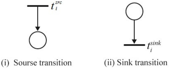 Figure 2 shows the source (i) and sink (ii) transitions, and Figure 3 shows a synchronous transition. Note that we use discrete Petri nets in the present study.