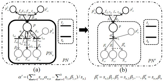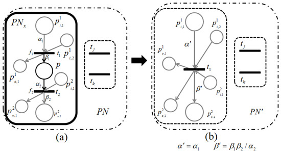 - Shrink of conflict structure:If a place picked up from the queue has a self-loop or a transition of one-input and one-output (as shown in Figure 9), this place is shrunk.