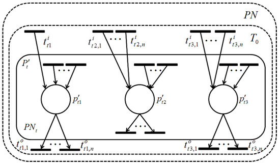 In fact, there exists at least one T-invariant in an , which indicates a firing counting vector of transitions in a periodic firing sequence [26] that leads back to the marking where it starts. This is because actually, the firing frequencies of all of the transitions construct a T-invariant.