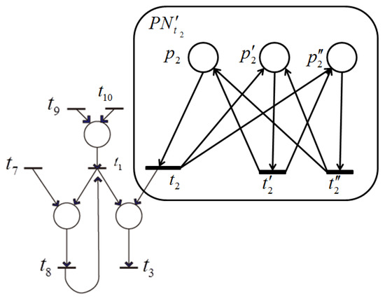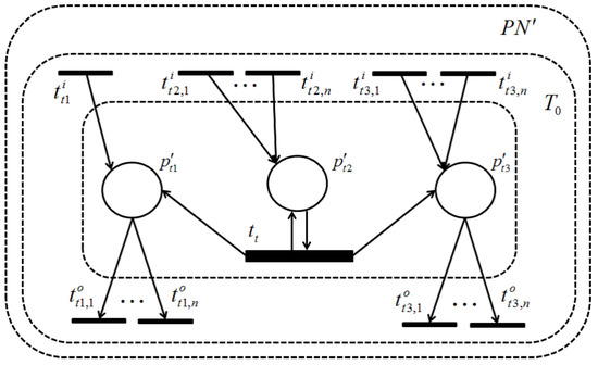 Case (2) (ii) implies that the remaining net includes a subnet that consists of transitions that all have a dependent relation, but cannot be shrunk into a single transition by shrinking the single-input and single-output structure (Figure 7) or the conflict structure (Figure 8). , shown in Figure 17, is such a subnet, where each transition has at least one input place with one output, which means in . To find such a subnet, we should establish a series of linear equations for all places according to the retention-freeness in which the input and output token flows are equal and solve these equations. Because in , the number of equations is more than that of the variables (firing frequencies of the transitions). Thus, if there are exactly linear independent equations, then all of the transitions satisfy a dependency relation. A detailed discussion of this remains as a future issue.