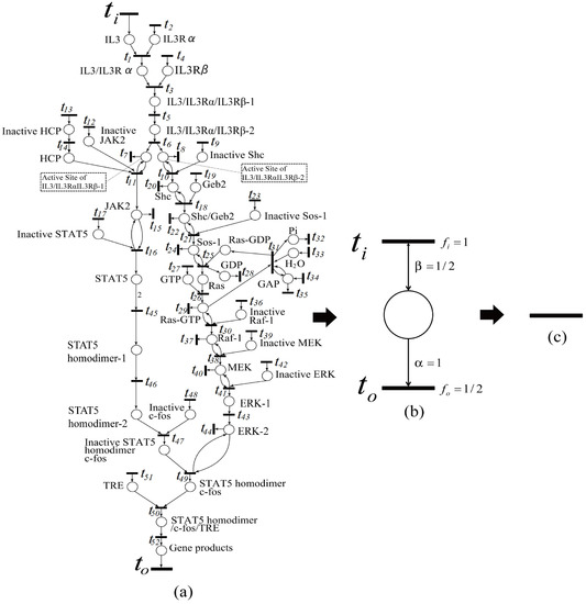 In the intermediate shrunk net (see Figure 15b), by assuming the firing frequency of the input transition to be available (say one), then the firing frequency of output transition is . Recursively, we can derive all of the firing frequencies in the IL-3 Petri net model.