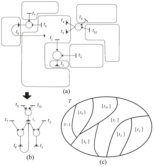 Case (2) (i) indicates that all transitions in the remaining net are independent, and each is a representative of an equivalence class, as can be illustrated in Figure 16. In this Figure 16a, each transition set is rounded by a line, and the transitions included in each set satisfy a dependency relation with one another. Applying dependent shrink, the transformed net is obtained as shown in Figure 16b. Further, the equivalence classes of represented by are shown in Figure 16c.