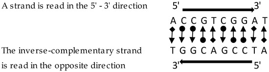 ′ (the beginning and ending positions of a DNA strand are denoted as 5′ and 3′, respectively; a DNA strand is read in the 5′ to 3′ direction, and the complementary strand runs in the opposite direction). The bases in each pair are complementary. The content of adenine (
