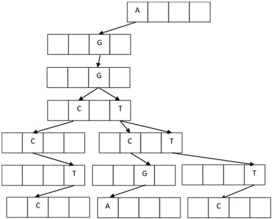 22]. It is a tree structure that forms prefix texts that are converted into a search index for the new texts. The new texts fit with the prefix and complement the branch of the tree with a suffix. In our problem, the prefixes and suffixes are letters from the alphabet: A, C, G, T.