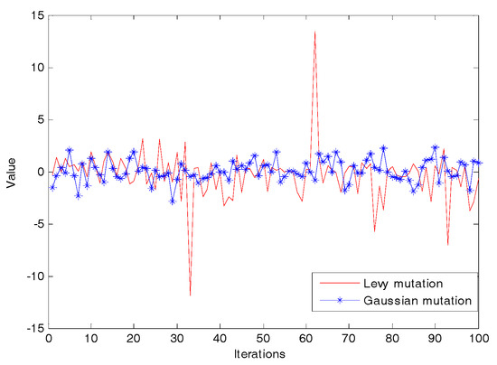 As Figure 1 shows, the Levy mutation has a stronger perturbation effect than the Gaussian mutation. In the Levy mutation, the occasional larger values can effectively help jump out of the local optimum and keep the diversity of the population. On the contrary, the Gaussian mutation has better stability, which improves the local search ability.