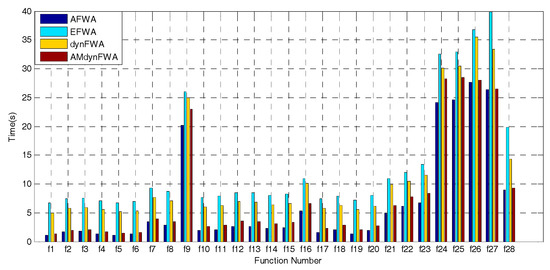 The results from Figure 3 indicate that the average run-time cost of EFWA is the most expensive among the four algorithms. The time cost of AFWA is the least, but the run-time cost of AMdynFWA is almost the same compared with AFWA. The run-time cost of AMdynFWA is less than that of dynFWA. Taking into account the results from Table 3, AMdynFWA performs significantly better than the other three algorithms.