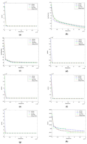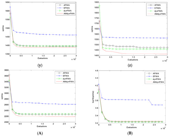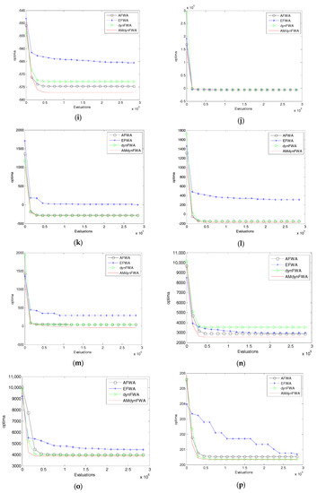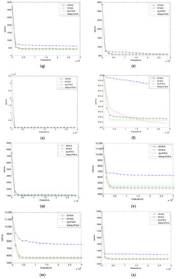 The EFWA, AFWA, dynFWA, and AMdynFWA searching curves. (a) f1 function; (b) f2 function; (c) f3 function; (d) f4 function; (e) f5 function; (f) f6 function; (g) f7 function; (h) f8 function; (i) f9 function; (j) f10 function; (k) f11 function; (l) f12 function; (m) f13 function; (n) f14 function; (o) f15 function; (p) f16 function; (q) f17 function; (r) f18 function; (s) f19 function; (t) f20 function; (u) f21 function; (v) f22 function; (w) f23 function; (x) f24 function; (y) f25 function; (z) f26 function; (A) f27 function; (B) f28 function.