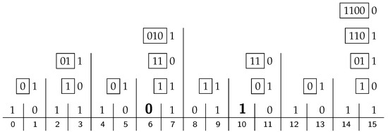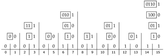 Continuing with the running example, Figure 3 shows the content of all the processors for the given input of size n = 15 = 2 4 - 1 . We start with the bit-vector of Equation (1) in line 0, shown here immediately above the horizontal rule, including zeros at positions 2 i , which are substituting for the parity bits to be filled in. The indices of the bit positions are given below the rule. The ith line above line 0 shows the contents of the processors at level i, with the x bit right-justified, and the B-vector shown in a box to its left. The B vector in the top right corner contains the Hamming parity bits, which are 0110 in our case.